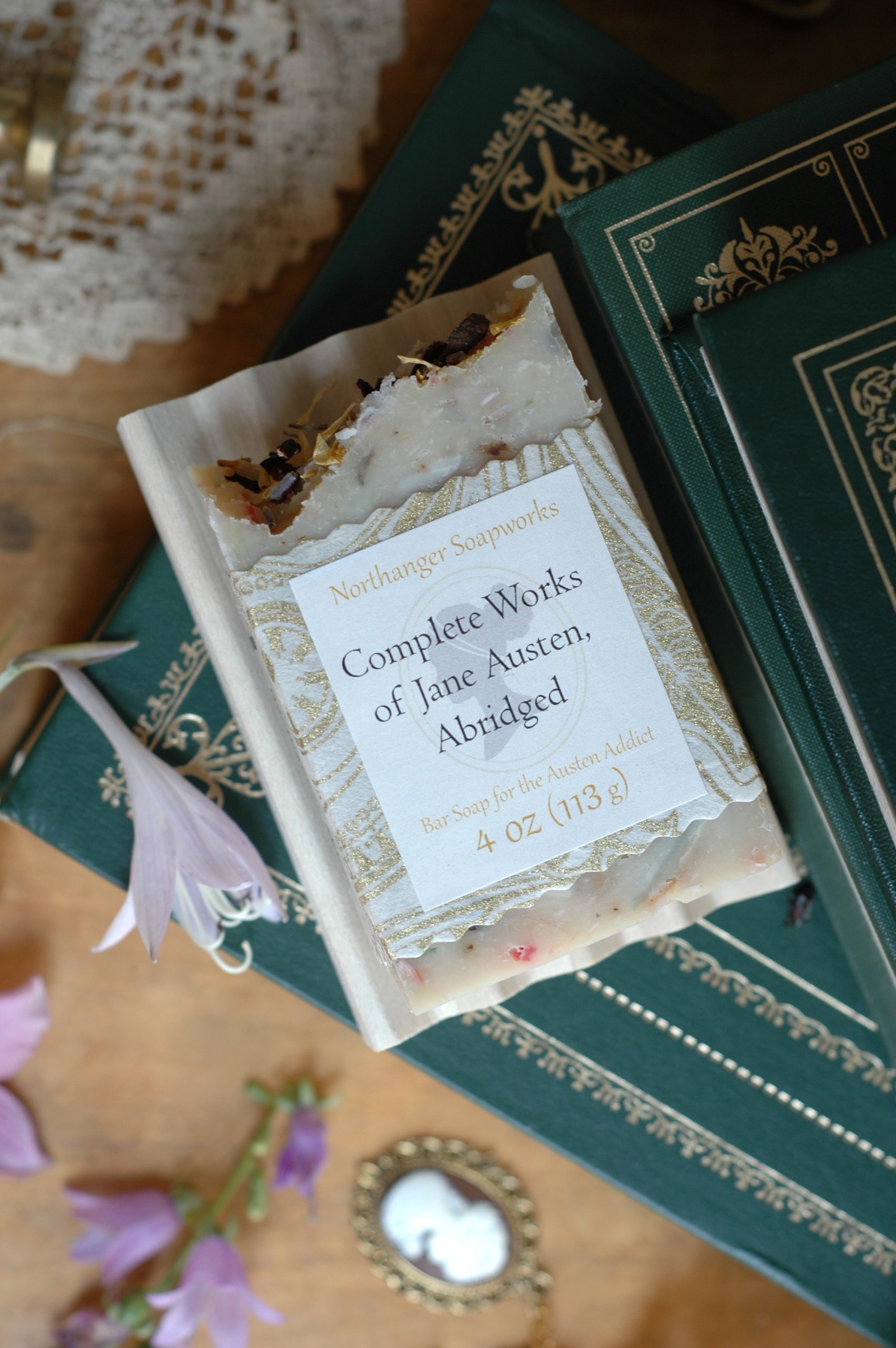 The Complete Works of Jane Austen, Abridged contains scraps of all our other Jane Austen soaps made throughout the past year! We make a new batch of soap as a binder and stir the scraps into it, along with extra fragrance.