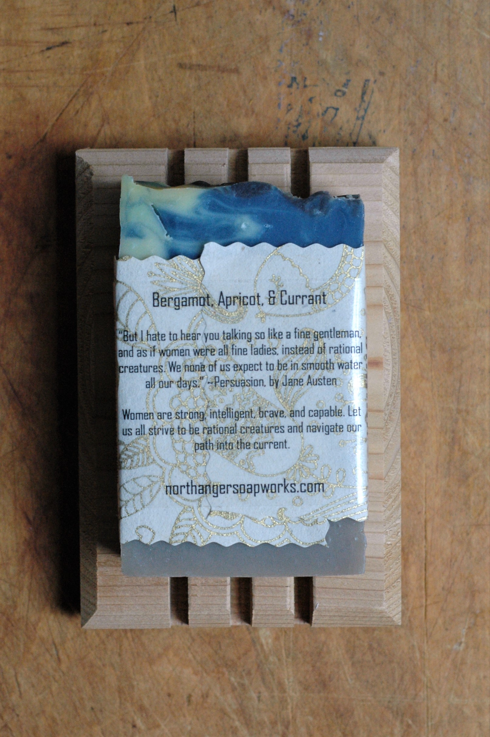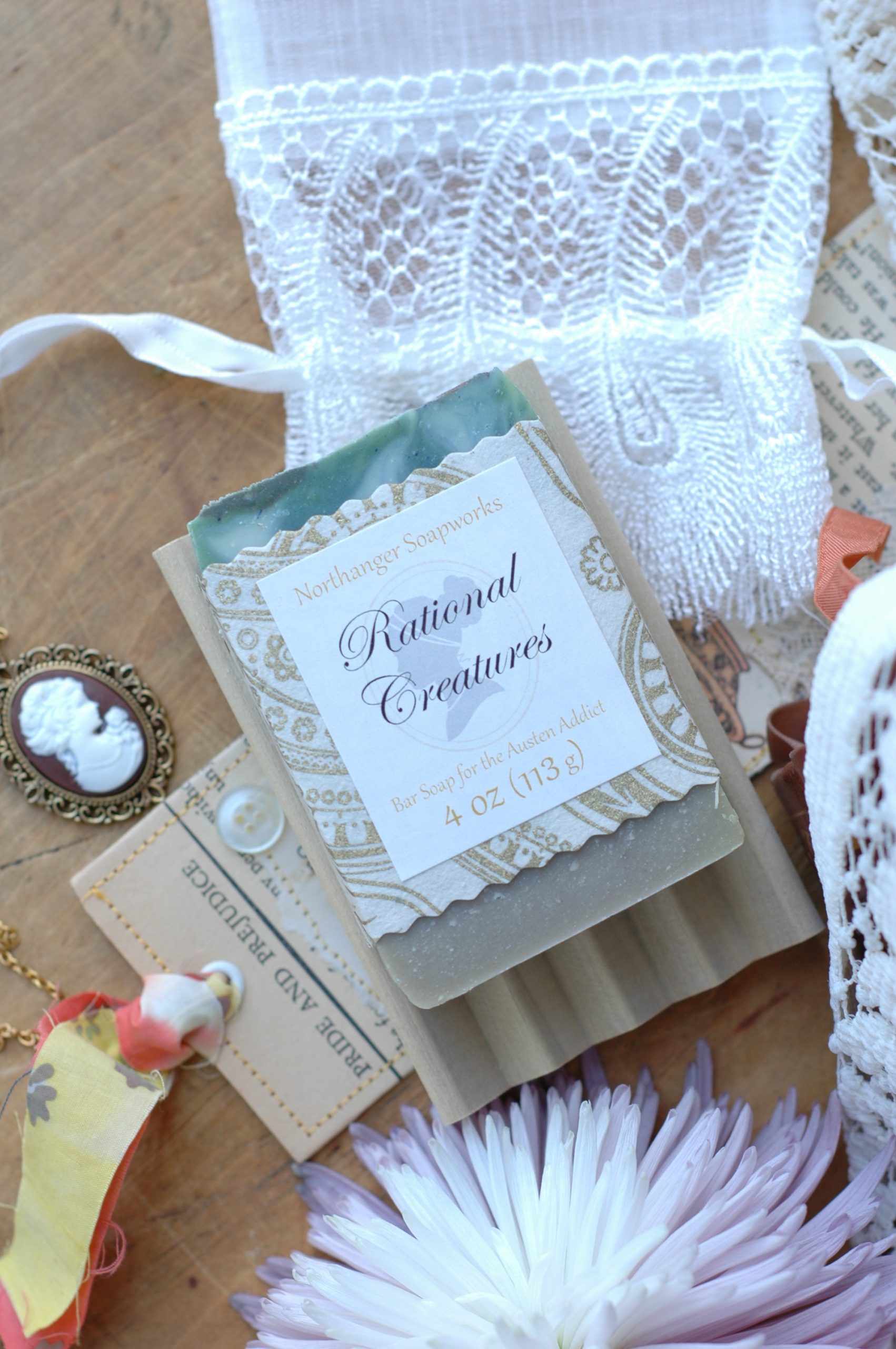 Rational Creatures bar soap is a fresh and clean scent with notes of bergamot, apricot, and currant. The bar depicts an artistic scene of wild ocean currents, strong and willful. These are not calm waters! Mrs. Croft would be right at home among the waves.