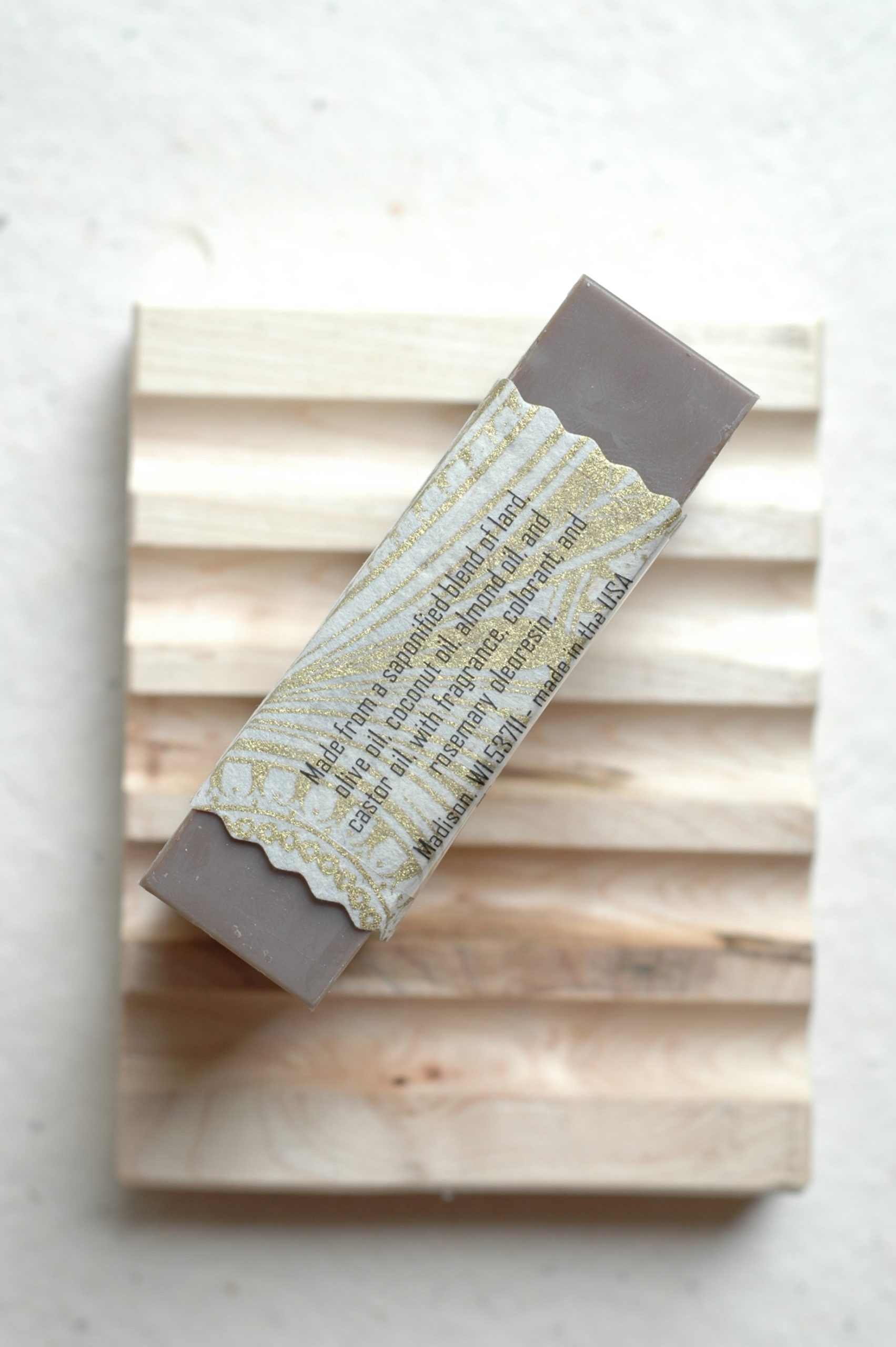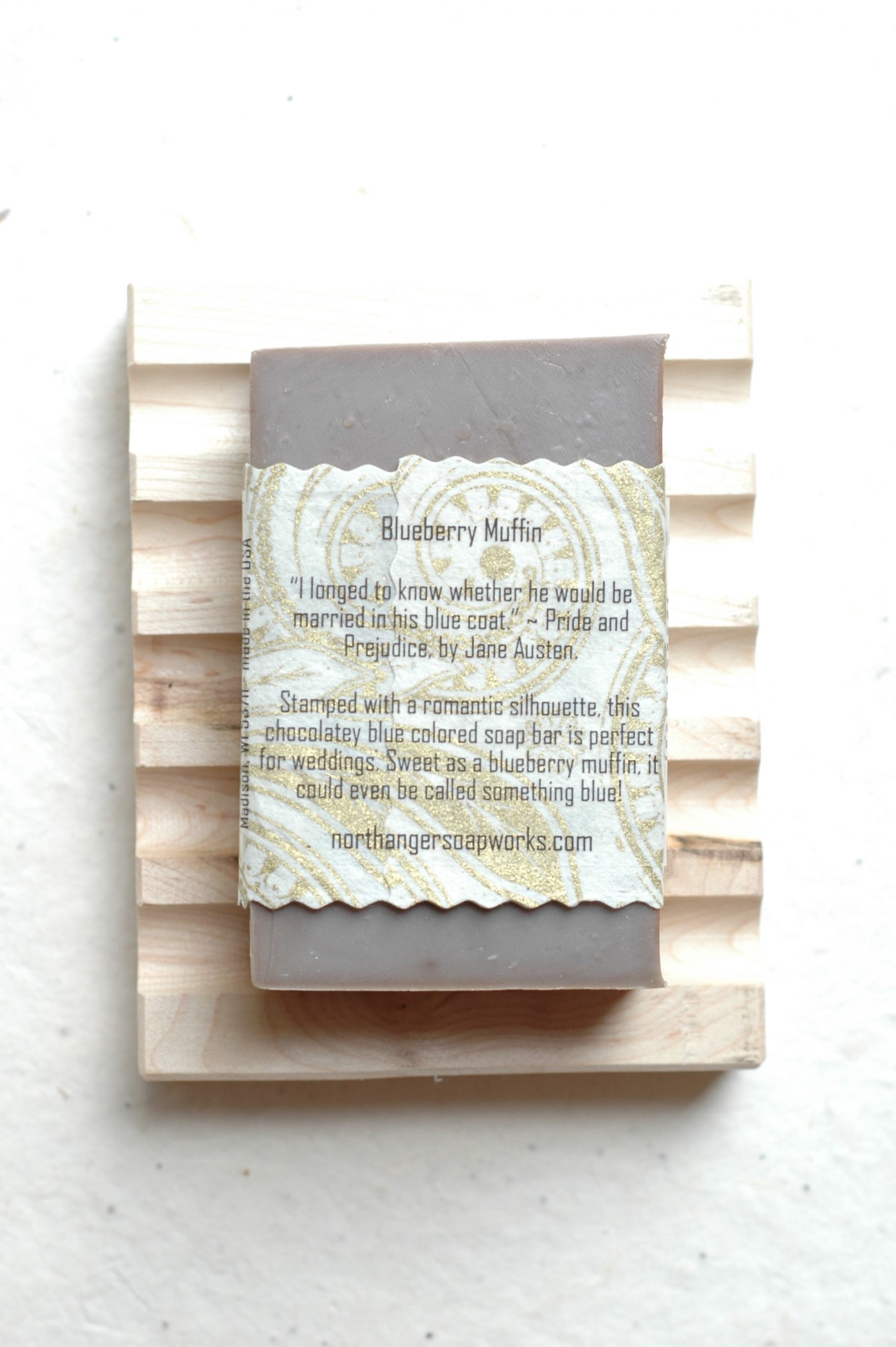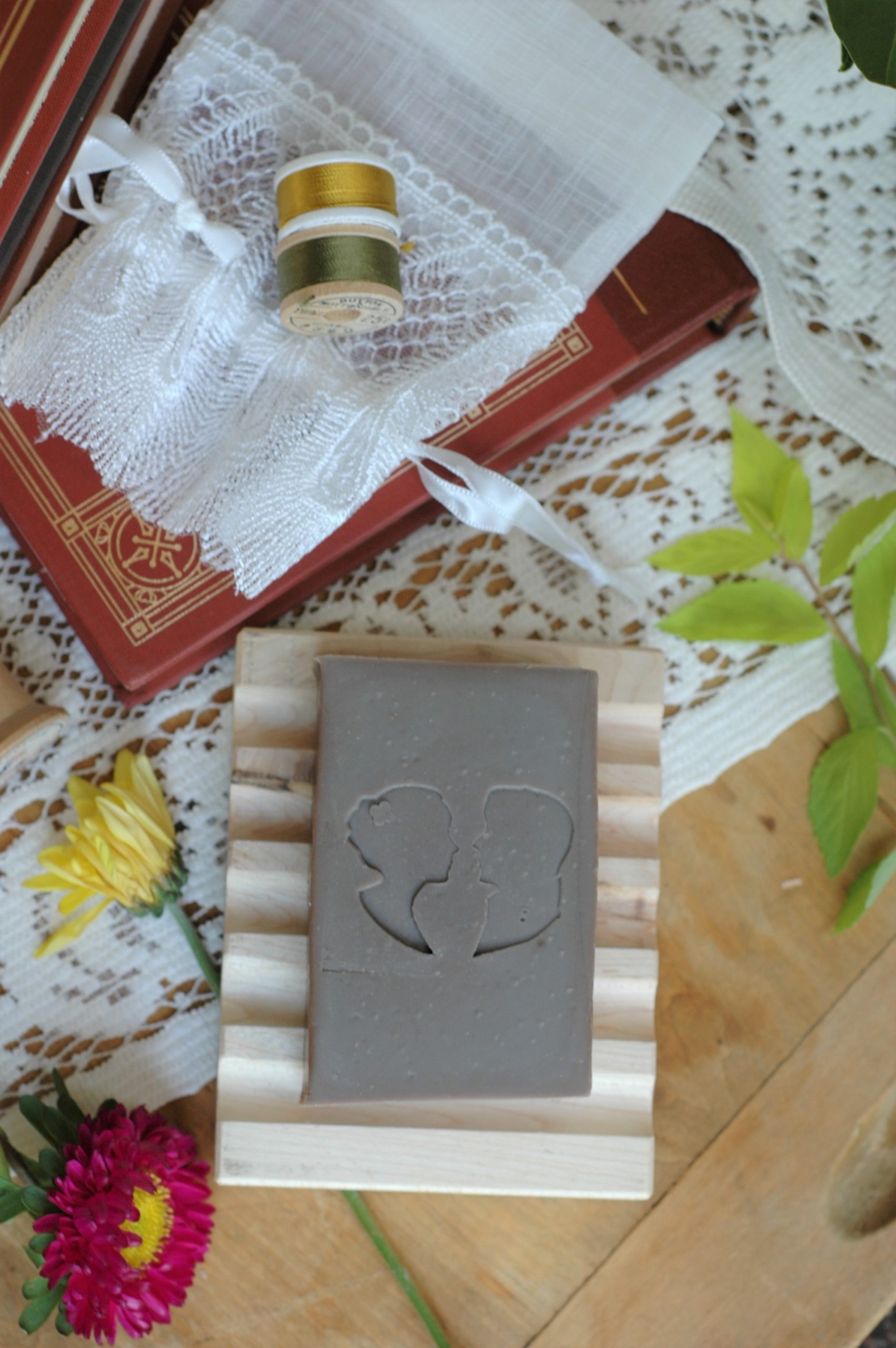 Stamped with a romantic silhouette, this chocolatey blue colored soap bar is perfect for weddings and brides.