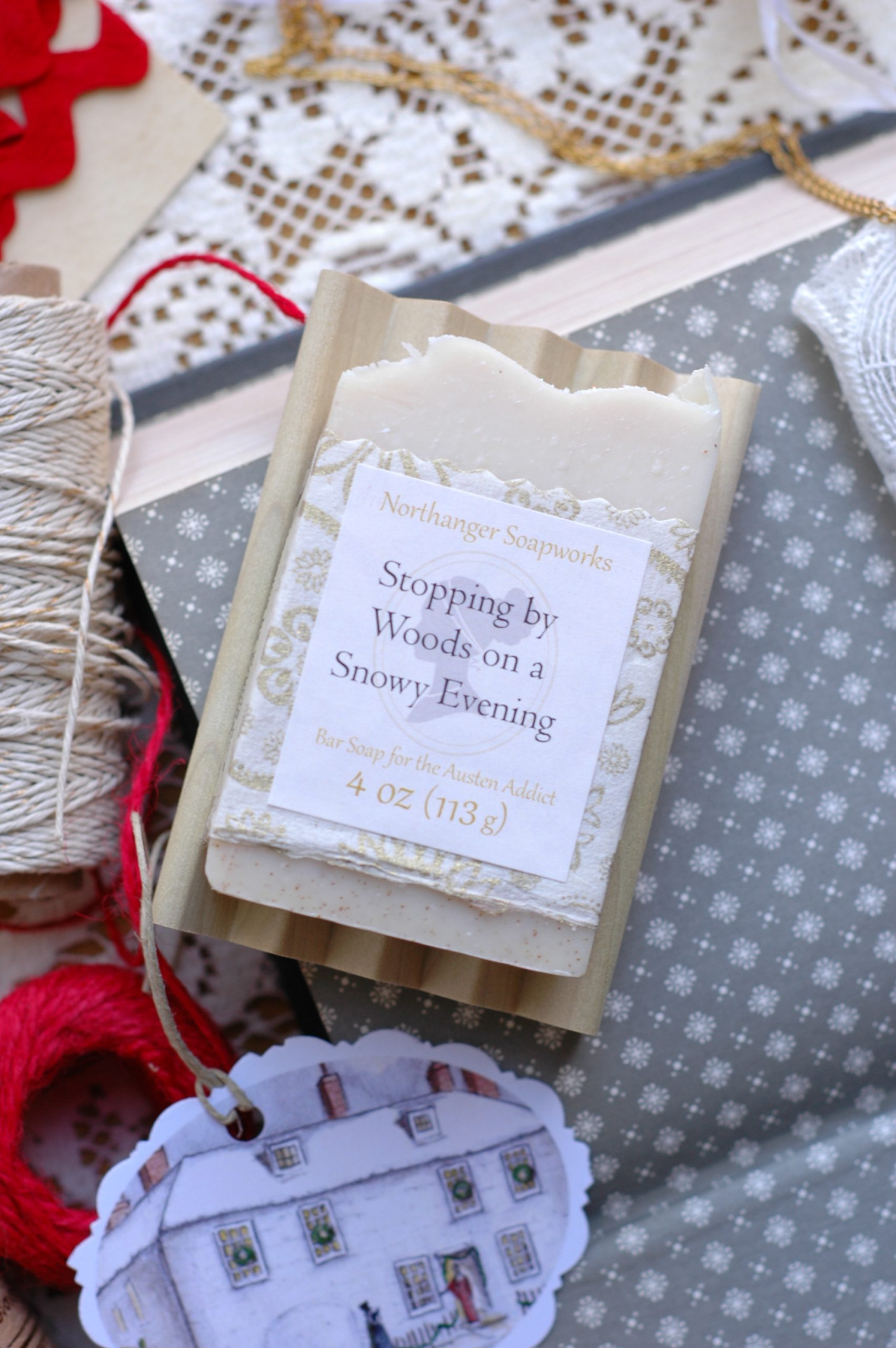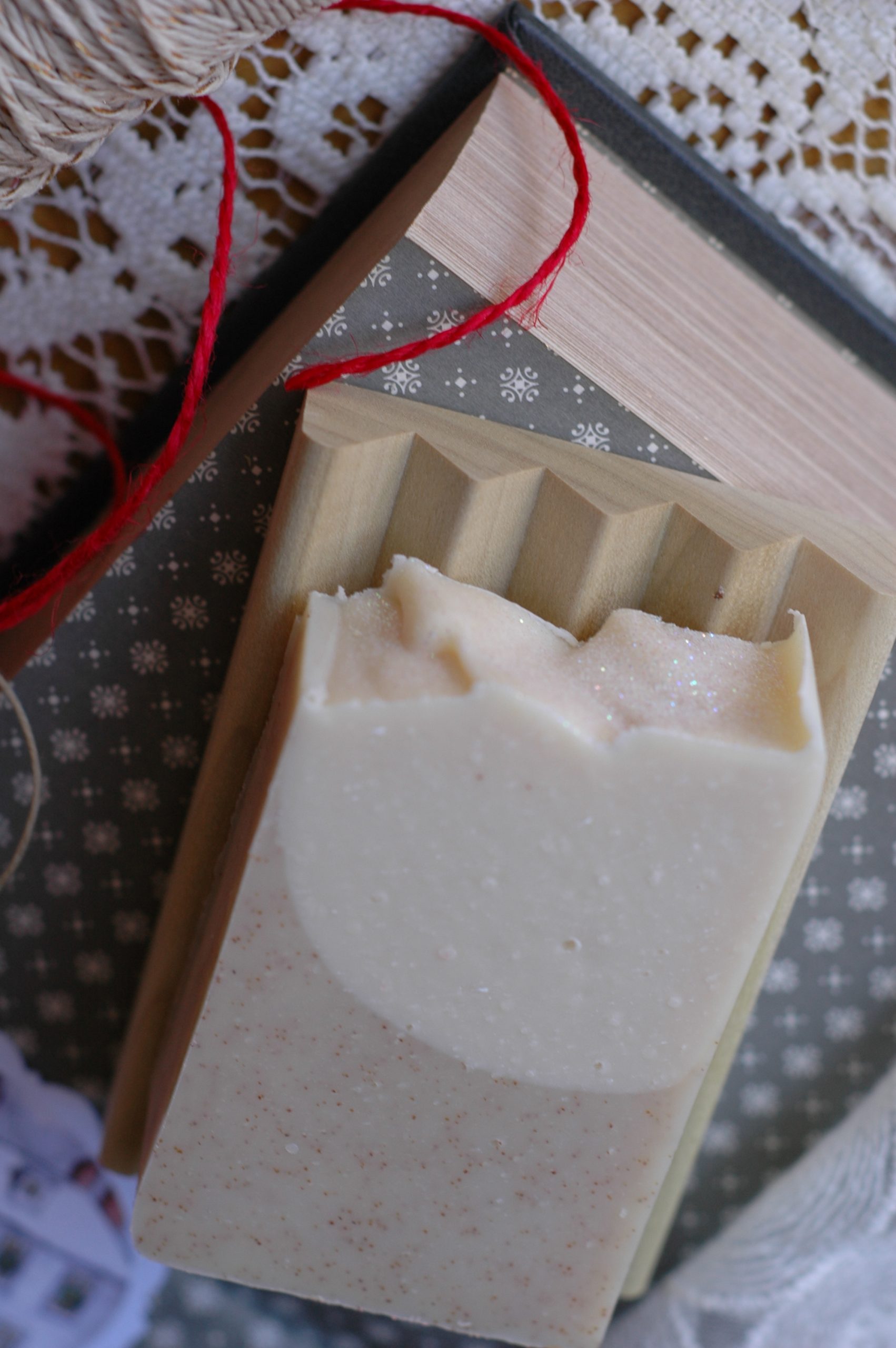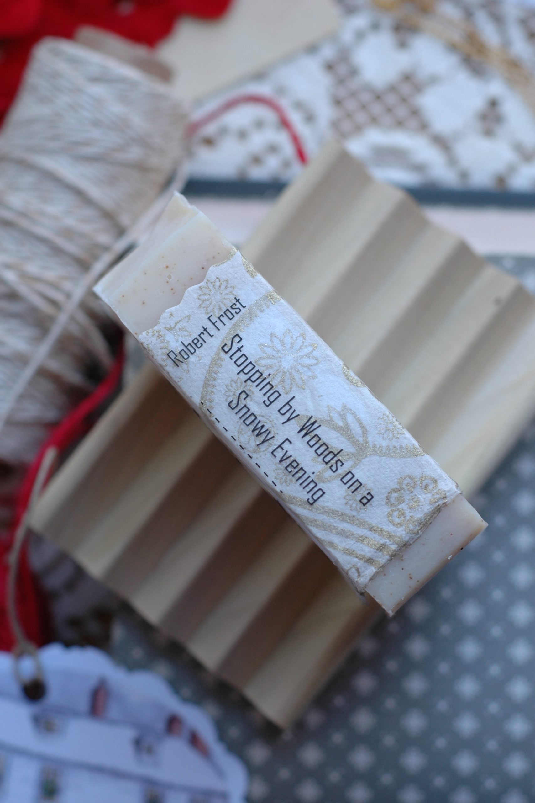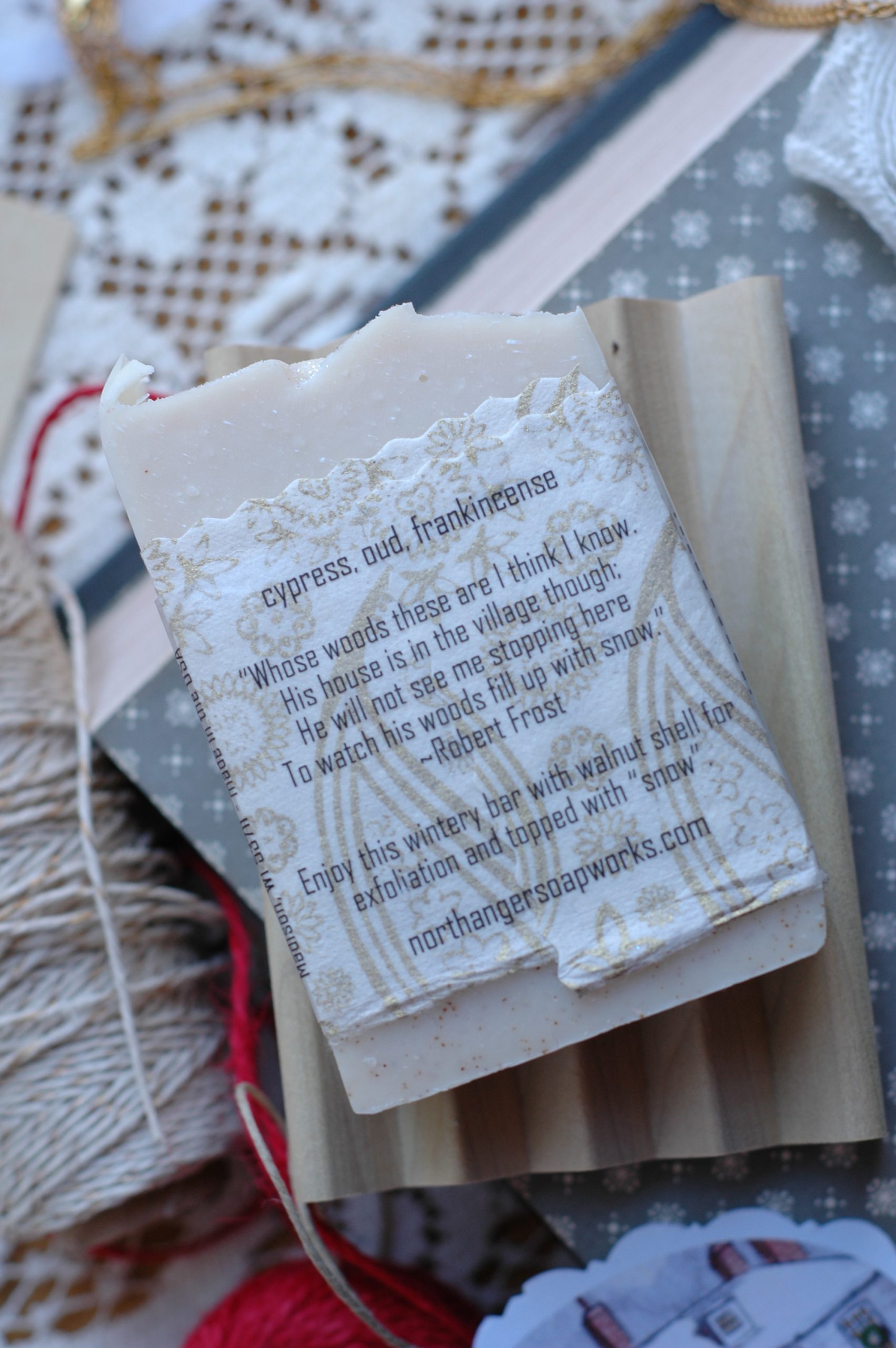 Inspired by the Robert Frost poem, this cypress, oud, & frankincense scented soap smells just like you’re in a snowy wood. Topped with a touch of white glitter for snow and contains walnut shell powder for the wood. It is an exfoliating bar.