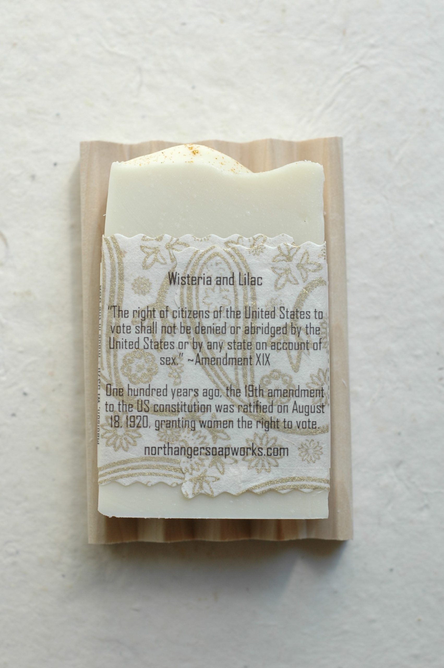 The white and gold colors of women’s suffrage come alive in this delicately scented wisteria and lilac soap. It commemorates the 100 year anniversary of women receiving the right to vote in the United States.