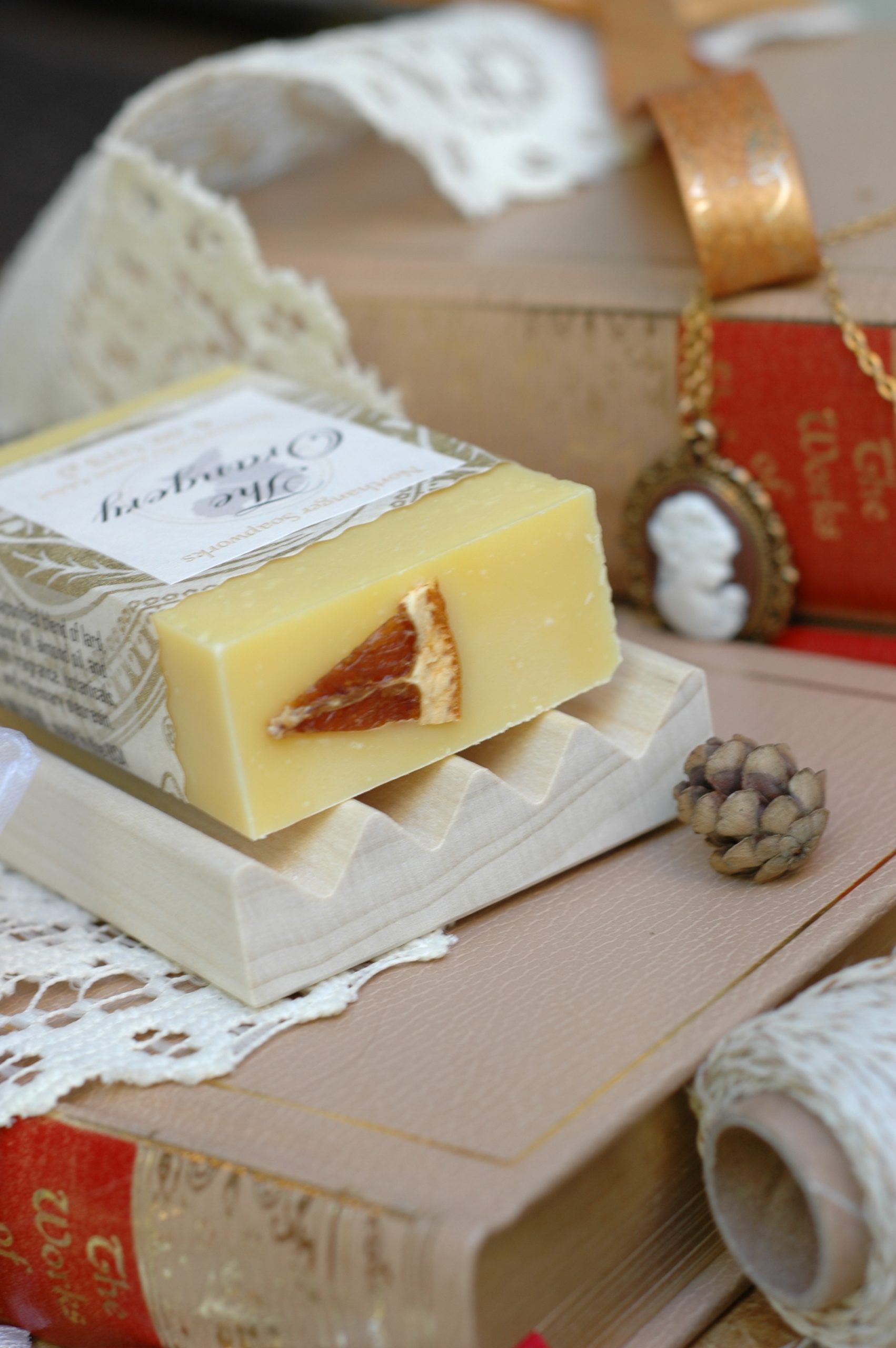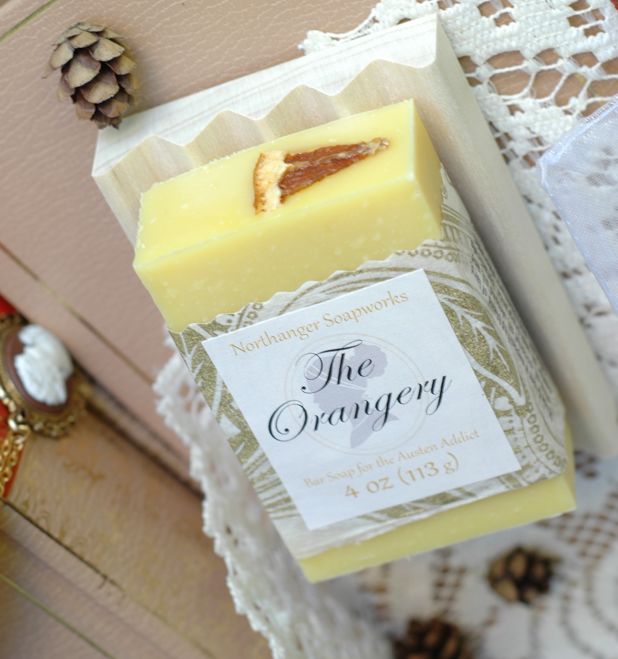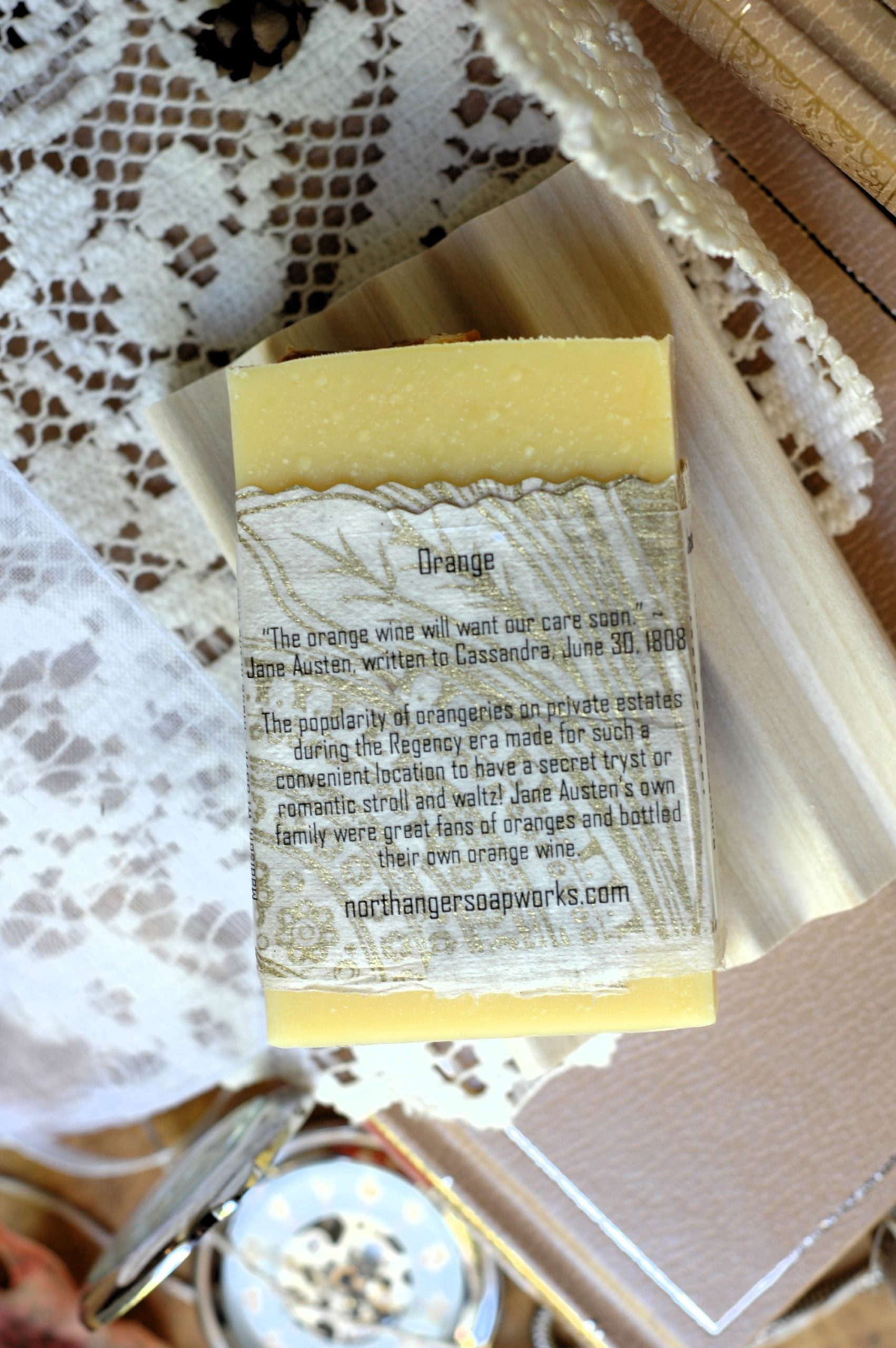 The Orangery soap is inspired by our love of winter oranges! The popularity of orangeries on private estates during the Regency era made for such a convenient location to have a secret tryst or romantic stroll and waltz!