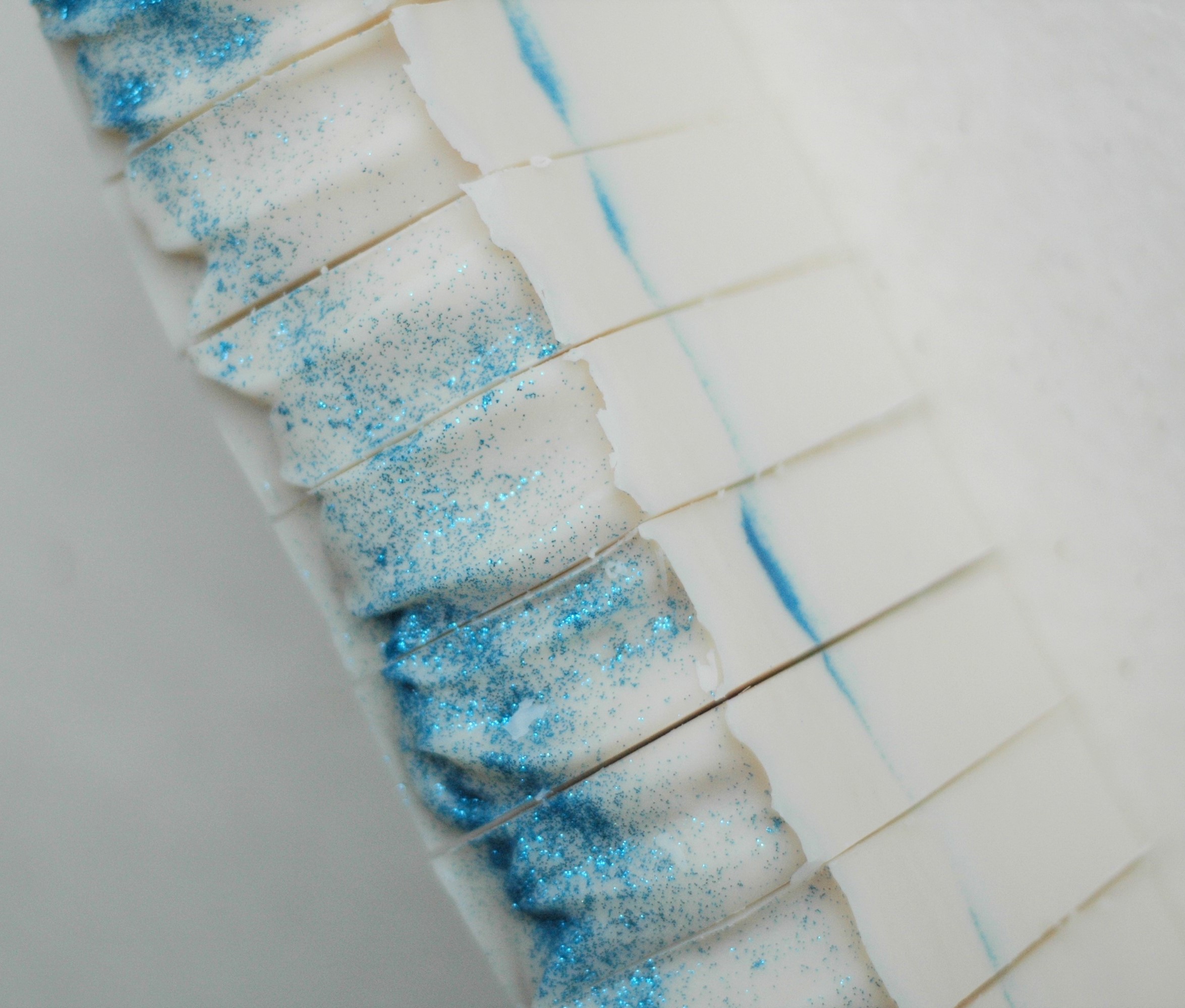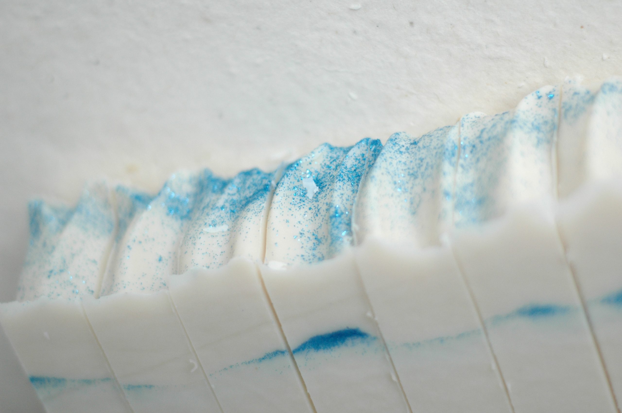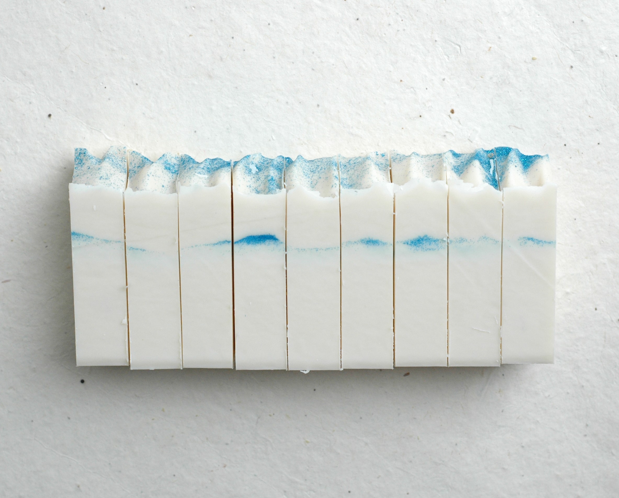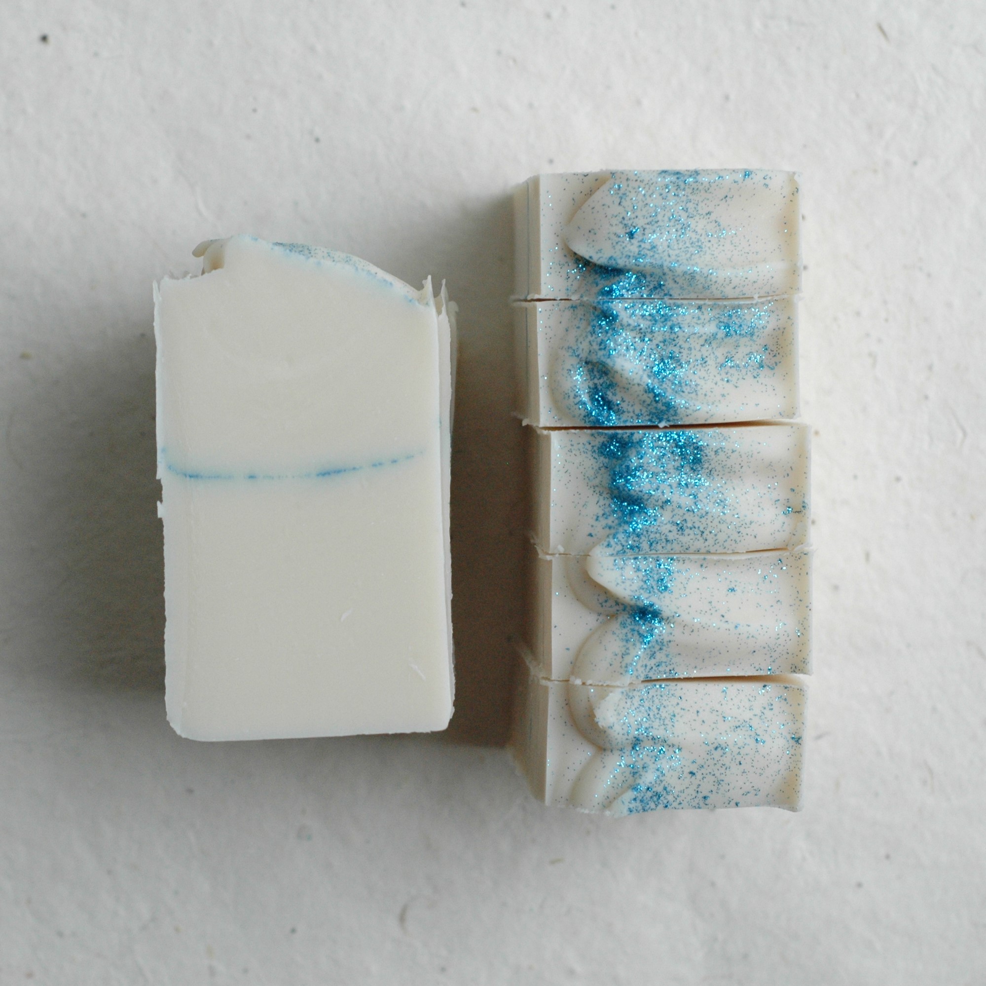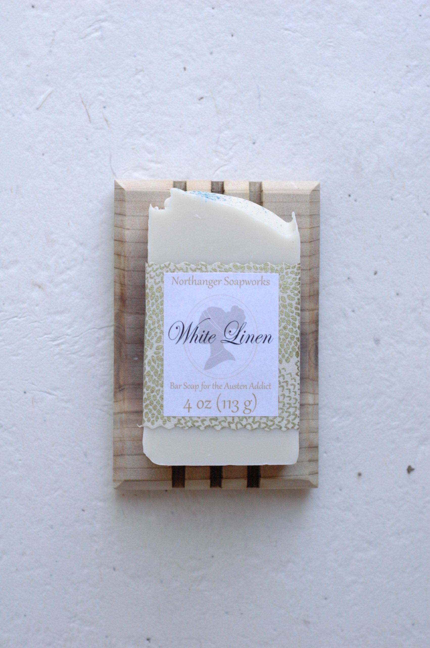 White linen soap smells like freshly laundered linen with floral notes of lilac and jasmine. The glittery blue streaking over the top and middle of the bar mimics the sky reflecting on a lake. All that’s missing is Mr. Darcy himself!