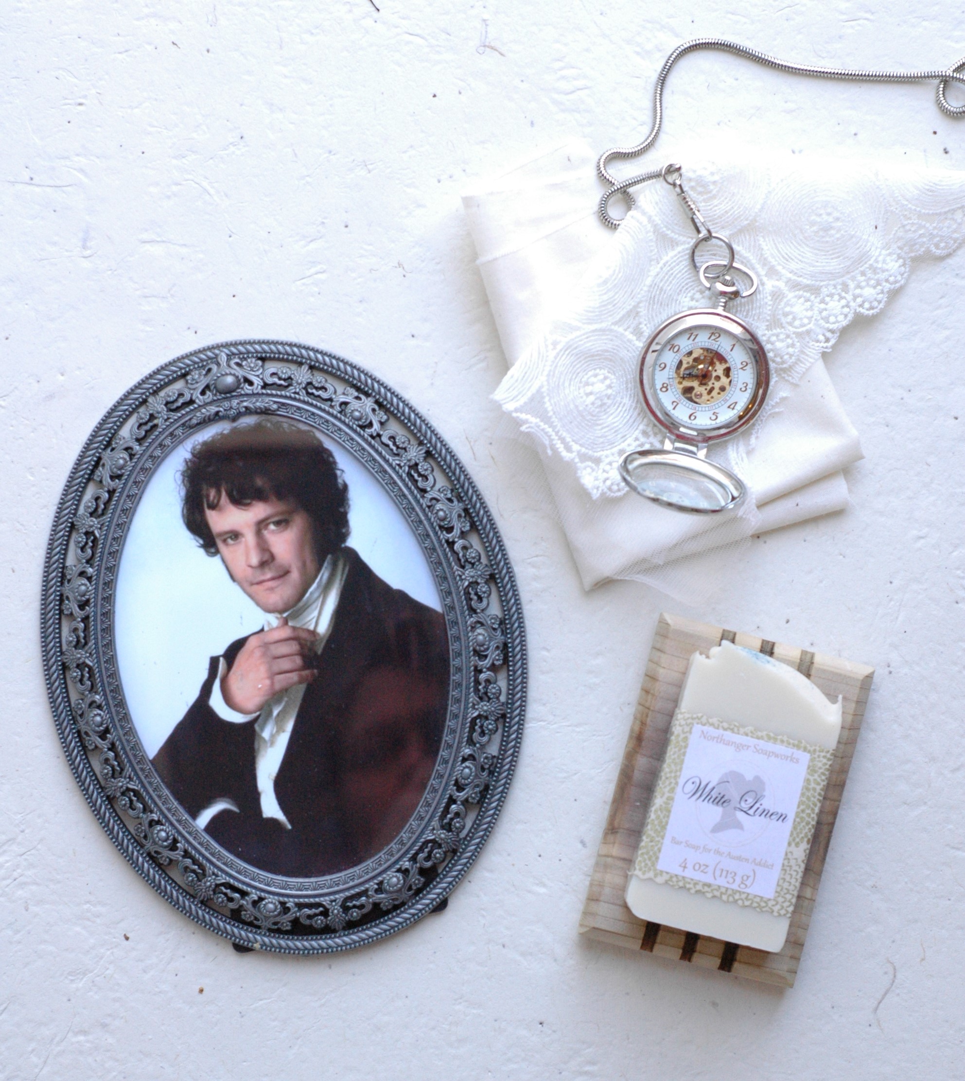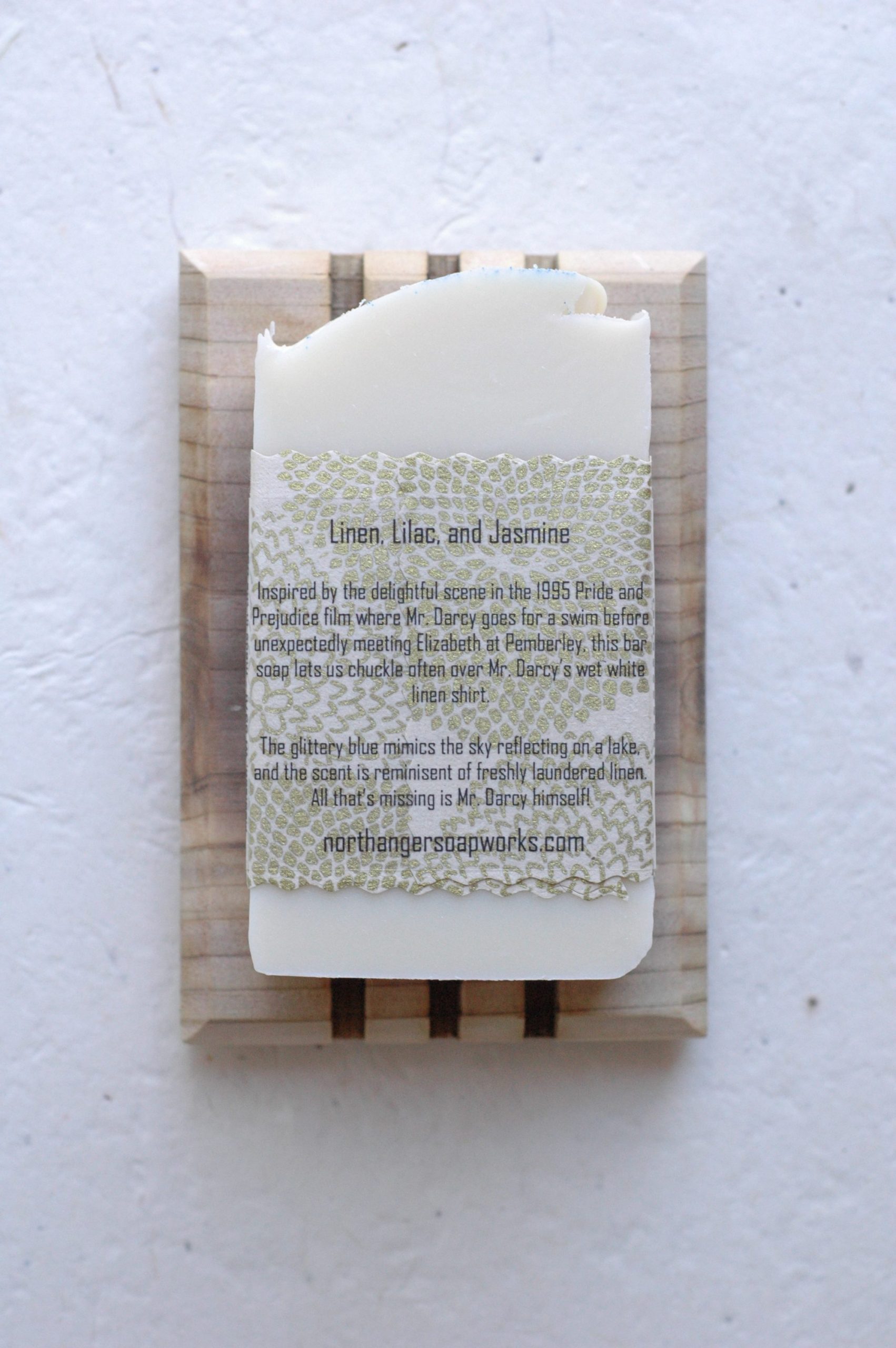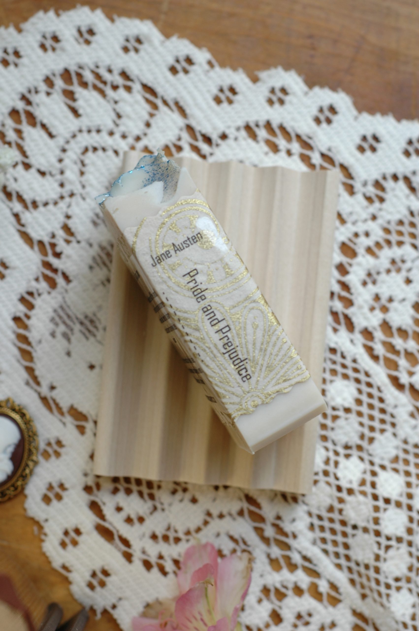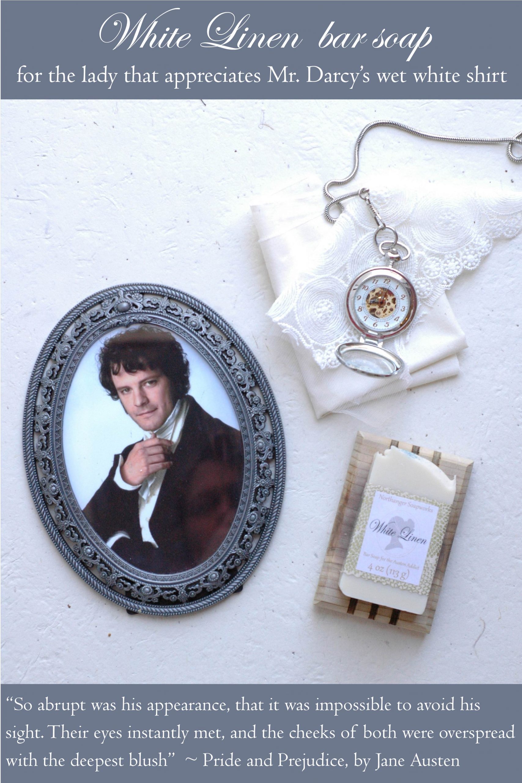 Inspired by the delightful scene in the 1995 Pride and Prejudice film adaptation where Mr. Darcy goes for a swim shortly before meeting Elizabeth at Pemberley, this bar soap lets us chuckle often over Mr. Darcy’s wet white linen shirt!
